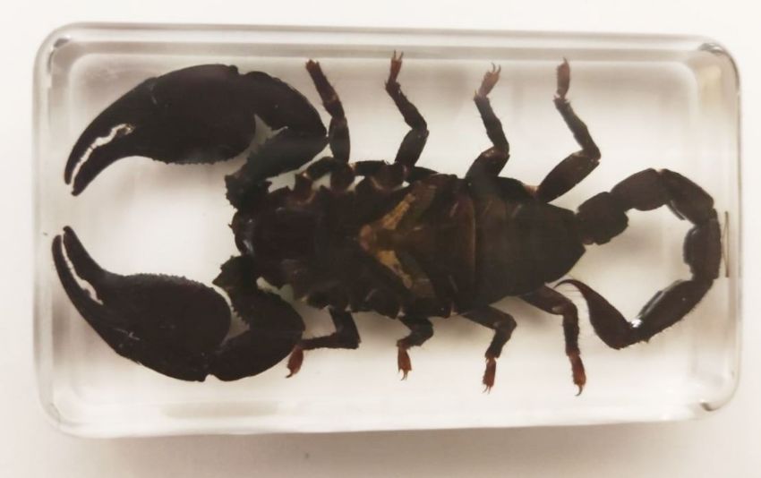 A boxed Asian black scorpion in resin block.