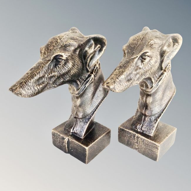 A pair of cast iron greyhound head bookends.
