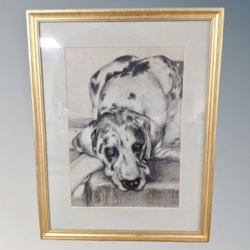 A charcoal study of a dog in frame and mount.