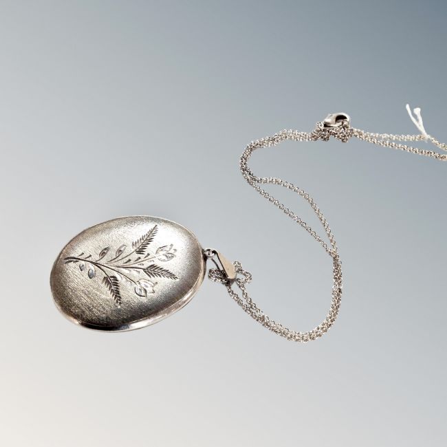 A large silver locket etched with flowers and ferns, Birmingham hallmarks, on sterling silver chain, 14.4g.