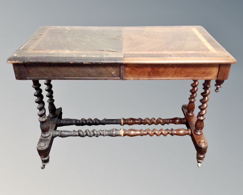 An Edwardian mahogany two tier shaped occasional table and a Victorian "Before and After" partially-restored occasional table with barley twist under stretchers (2)