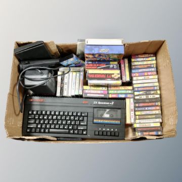 A box of Sinclair 128 ZX Spectrum Plus with adaptor and approximately 50 games