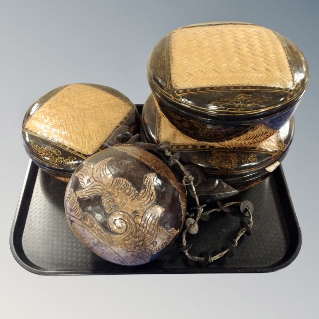 A set of three Japanese wicker and lacquered graduated baskets, further nut shell basket.