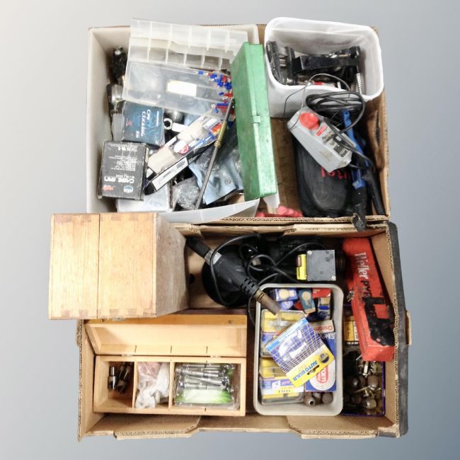 Two boxes of hand tools, hardware, bulbs, blow lamp, wooden boxes etc