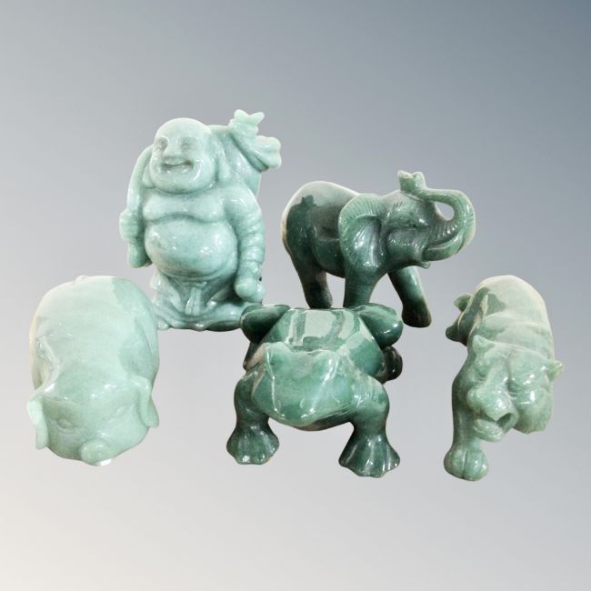 A green polished stone figure - Buddha together with four further polished stone animal figures