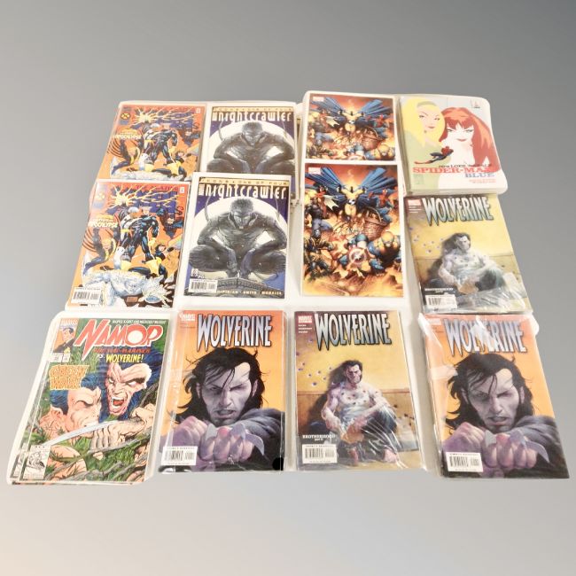 A tray of Marvel comics, Manor The Amazing X-Men, Spider-Man Blue, Wolverine etc. (Multiple duplicates)