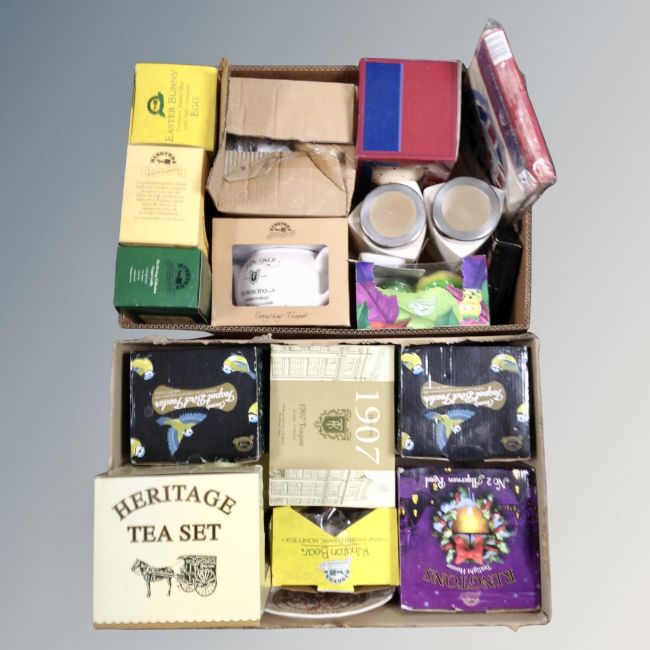 Two boxes of Ringtons Heritage tea sets, tea light houses, tea pots, ceramic money boxes, bird feeders, storage jars (most parts boxed)