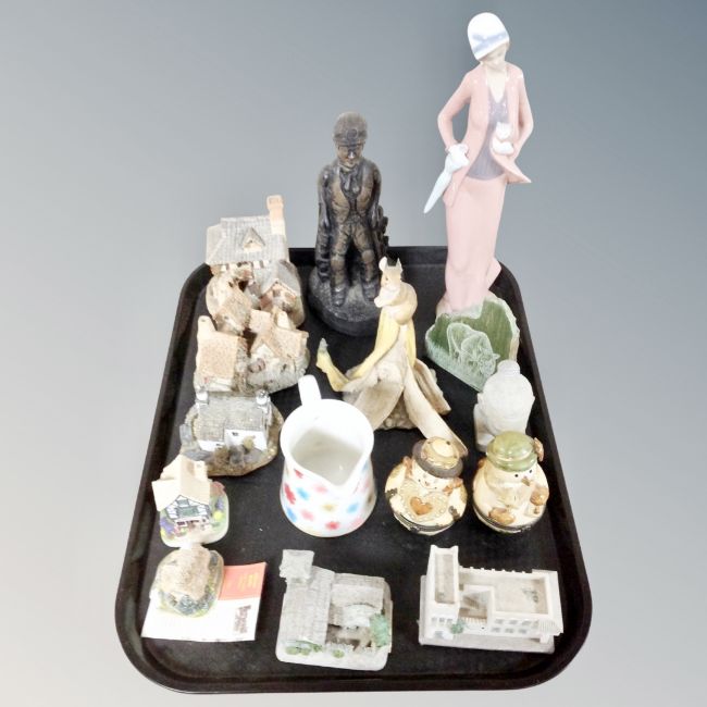 A tray of mining figure, Liliput cottages, Villeroy and Bosch snowmen lidded pots etc