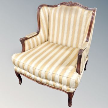 A French style carved beech armchair in golden and cream striped fabric