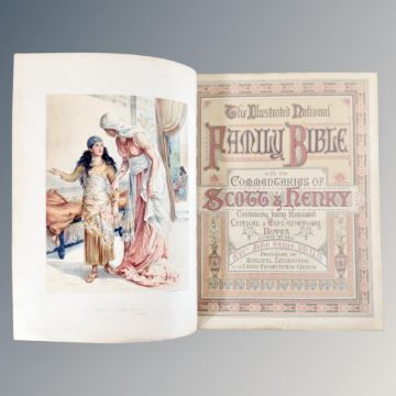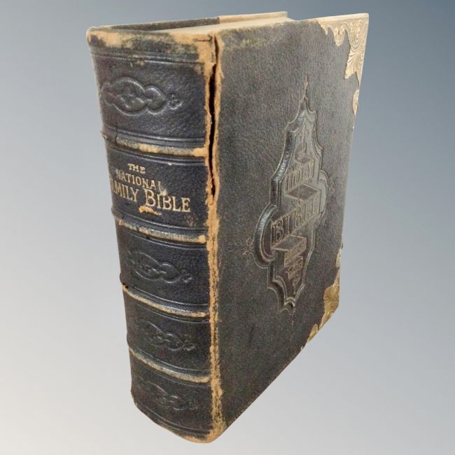 A 19th century leather and brass bound Holy bible with colour illustration book plates