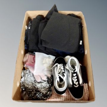 A box of assorted clothes, Vans trainers size UK 4