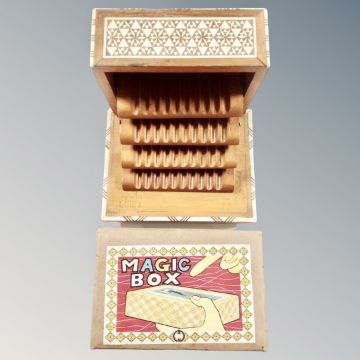 A 20th century wooden musical concertina cigarette box with mother of pearl inlay together with magic box in original box