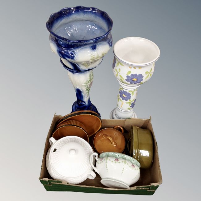 Two jardinieres on stand together with a further box containing 19th century chamber pot, soup tureens, oven dishes etc