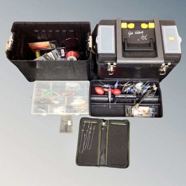 A plastic portable tool box trolley containing fishing equipment, hooks, lures, line etc