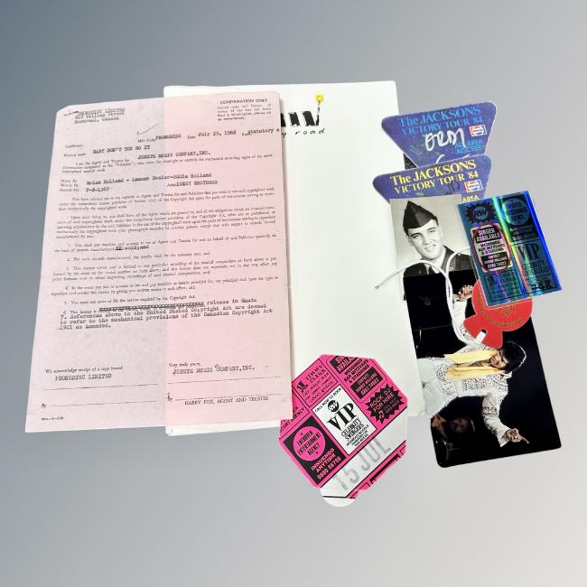 Collection of music memorabilia: An original Isley brothers contract dated July 29, 1968 for the song 'Baby don't you do it' for royalties between Jobete music company inc and the Isley brother's manager. An Elvis Presley photograph of Elvis in Atlanta July 3, 1973 taken by photographer Keith Alverson. Jackson's 1984 Victory tour 'All area access' passes /Robbie Williams passes and Abbey Road letterhead.