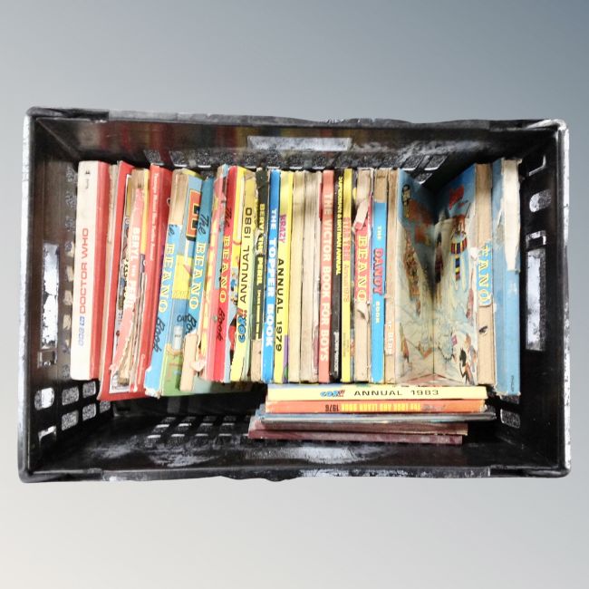 A crate containing a quantity of annuals, vintage Dandy Beanos etc.
