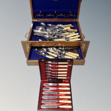 An antique cutlery canteen retailed by Goldsmiths Company of Newcastle containing part plated and stainless steel cutlery service