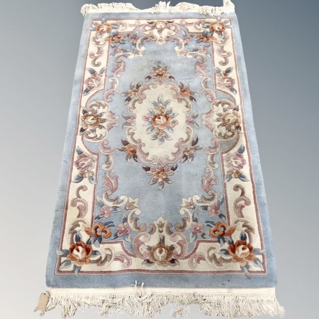 A Chinese fringed embossed rug on blue ground, 178cm by 93cm