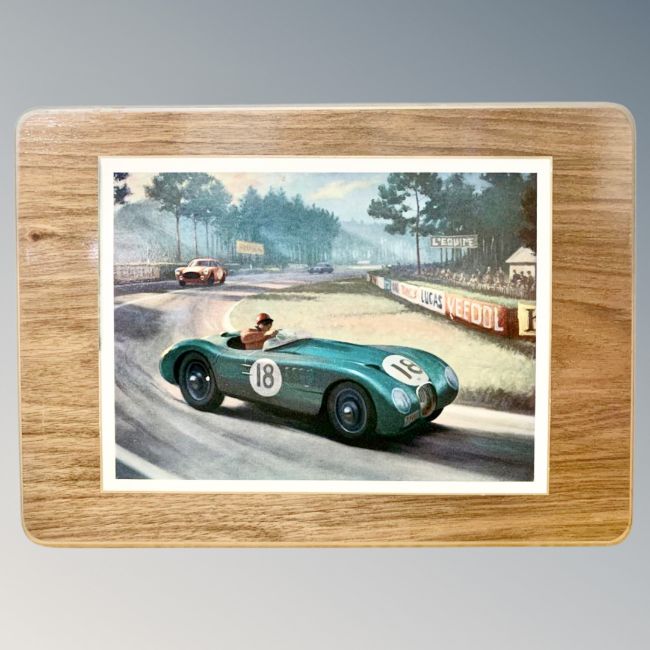 Jaguar Cars : A presentation set of six placemats all celebrating Jaguar race wins and records, illustrated with colour images depicting the various races from the 1950's, each with green baize backing and race details verso, each 19 cm x 27 cm, contained within a wooden box bearing the Jaguar emblem.