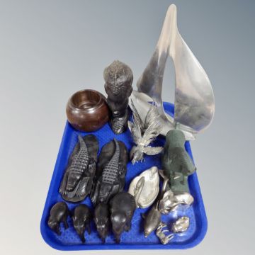 A tray of metal ornaments, carved hardwood African bust and animals, lawn bowls ashtray