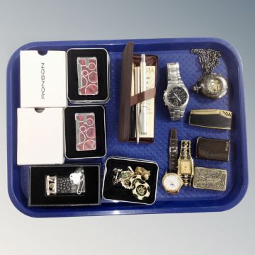 A tray of lighters, Ronson, enamelled pin badges, contemporary pocket watch, Gent's Seiko chronograph watch, Parker pens etc