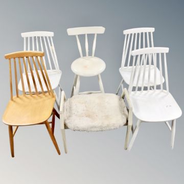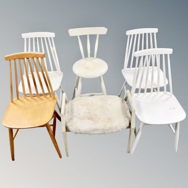 A set of four 20th century rail backed dining chairs (3 painted) together with a painted breakfast bar chair and stool (6)
