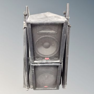 A pair of Stagg professional mixer amplifier speakers on tripod stands