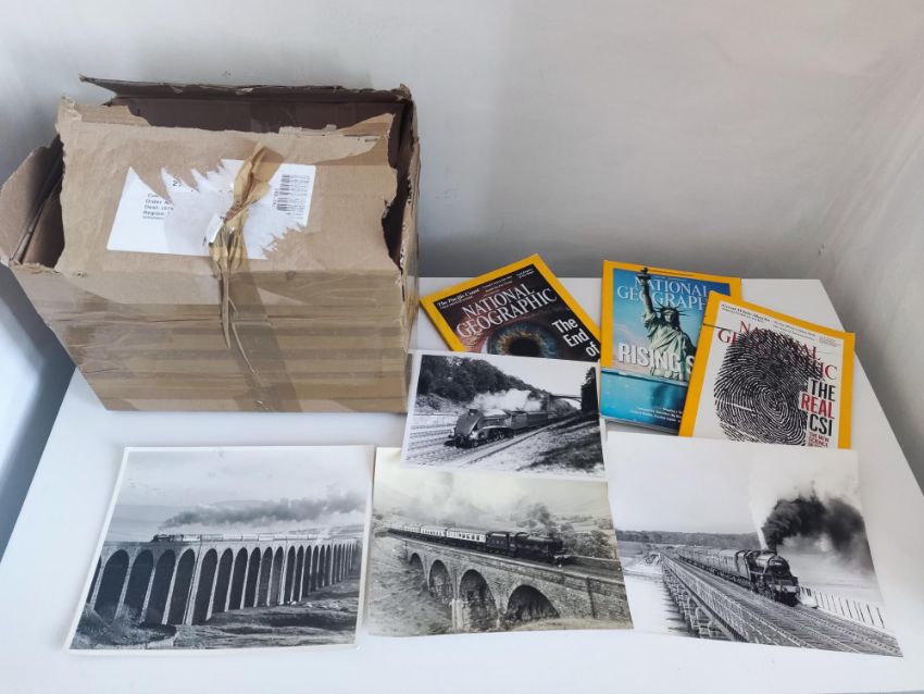 A box of 18 National geographic magazines and 25 vintage steam train photos