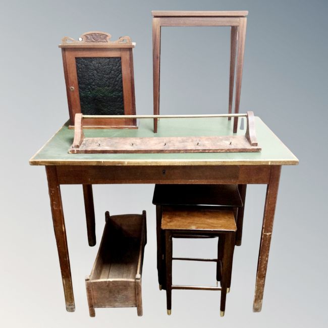 A 20th century beech library table fitted a drawer together with a nest of two tables, pine trough, wall rack, Art Nouveau wall cabinet and mid century rosewood occasional table