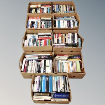 A pallet of nine boxes of hardbacked books, history, autobiographies, novels etc