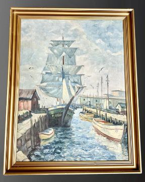 Victor Bertman : Tall ship in dock, oil on canvas, 47 cm x 62 cm, signed, framed.
