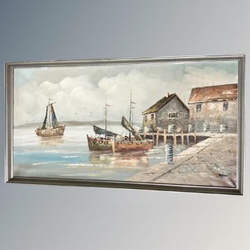 Twentieth century Continental School: Boats at low tide, oil on canvas, 80 cm x 41 cm, indistinctly signed. Framed.