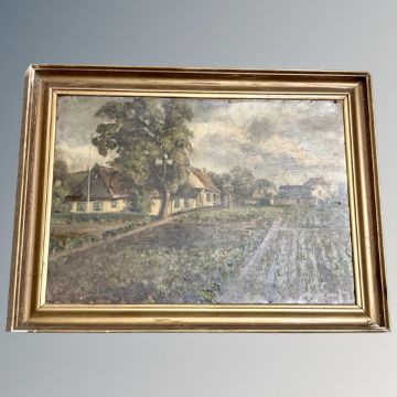 A Pedersen : An allotment view, oil on canvas, 55 cm x 39 cm. Framed.