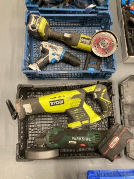 A collection of hand tools and power tools by Dewalt, Ryobi, small foot pump, portable saw etc. (Q)