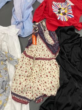 A quantity of new clothing, most with retail tags to include - H&M leather belt, pair of black COS jeans Euro 50, New Look orange bikini size 16, Primark Disney T-shirt, Children's Mickey Mouse pyjamas, Superdry dress size 14, Superdry Swimsuit size 10, H&M black gown, H&M black leather belt, Disney Princess dress, Cotton shirt, quantity of H&M baby wear etc. (Q)