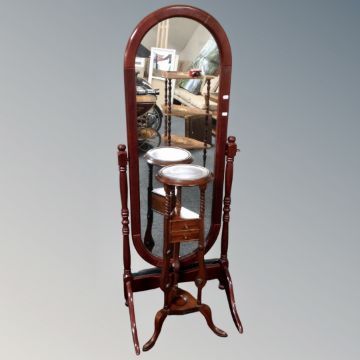 A hardwood wig stand fitted with two drawers, together with a cheval mirror.