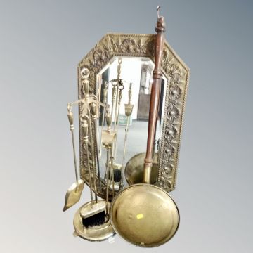 An octagonal brass framed embossed bevel edged mirror together with a four piece companion set on stand and a bed warming pan.