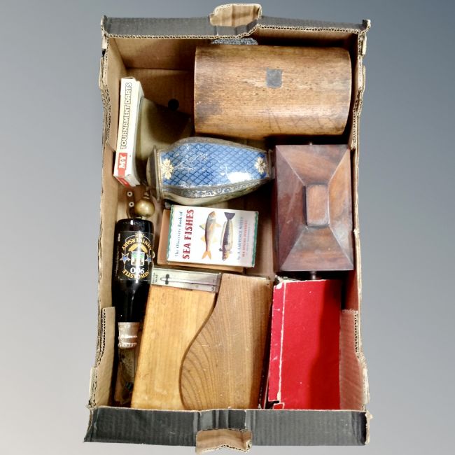 A box of old tea caddy, correspondence box both without interiors, Newcastle 900 anniversary ale etc
