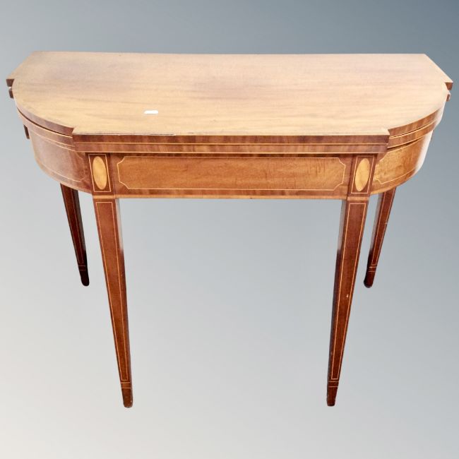 A Victorian inlaid shaped mahogany turnover top card table.