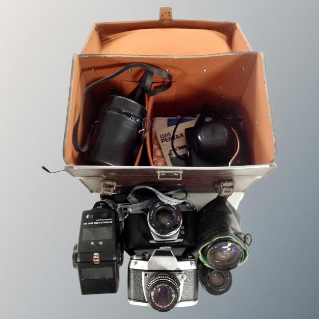 A vintage camera case containing Pentax Asahi camera with lens, German Ihagee camera with lens together with further lenses and accessories.
