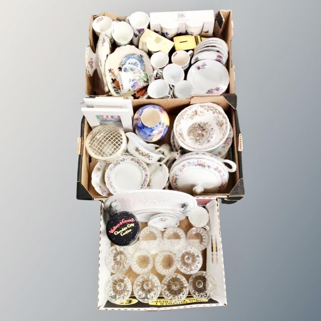 Three boxes containing assorted ceramics including dinnerware, Maling storm vase, glasses, serving plate etc.