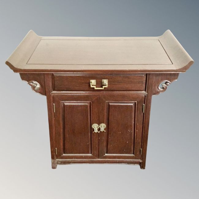 A Chinese hardwood double door altar cabinet fitted with a drawer.