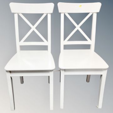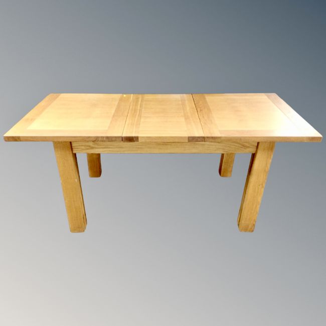 A contemporary oak pull-out dining table with leaf together with a set of six painted chairs.