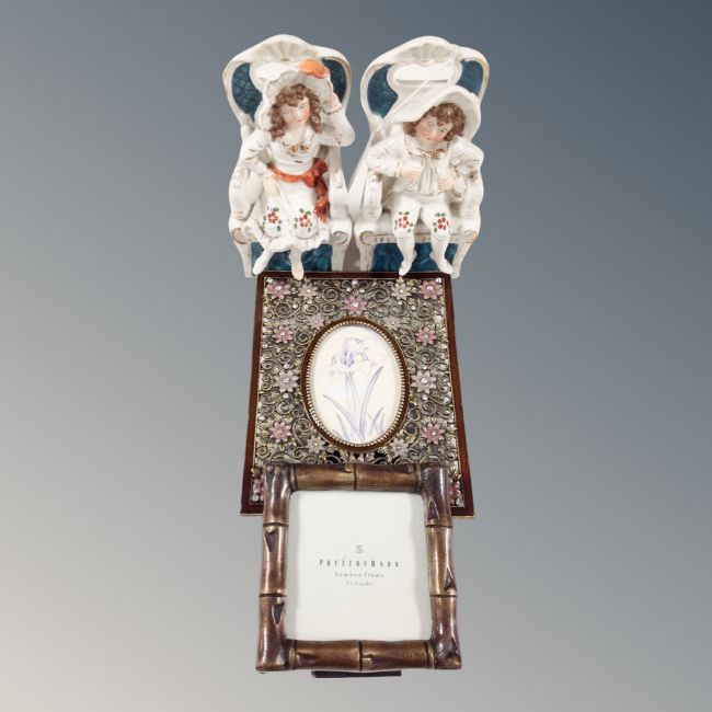 Two Victorian pottery figures of seated children together with a metal photo frame and a reticulated enamelled frame.