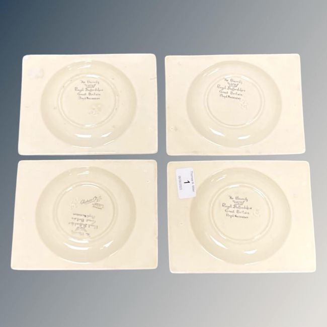A set of four Clarice Cliff rectangular cabinet plates, each 7 cm x 4 cm, reverse marks 'The Biarritz Royal Staffordshire'. (4)