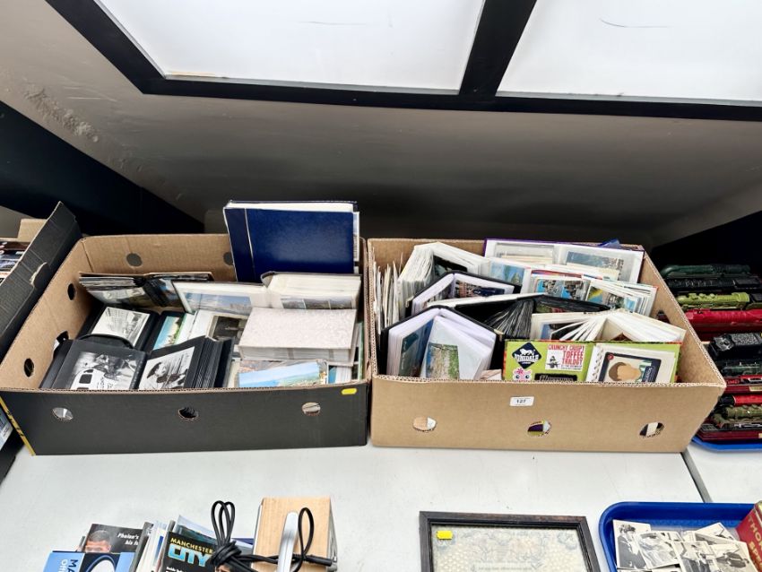 Two boxes containing photographs, postcards, cigarette cards in albums.
