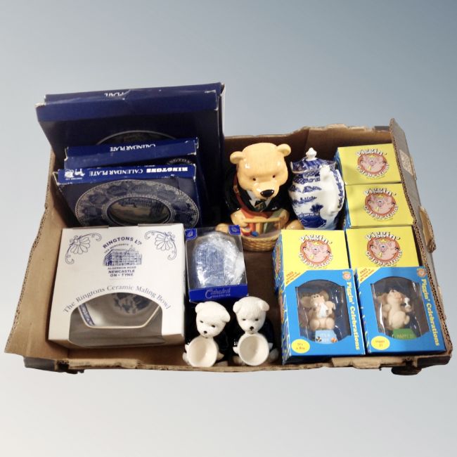 A box of Piggin figures, Ringtons blue and white plates, boxed caddy etc