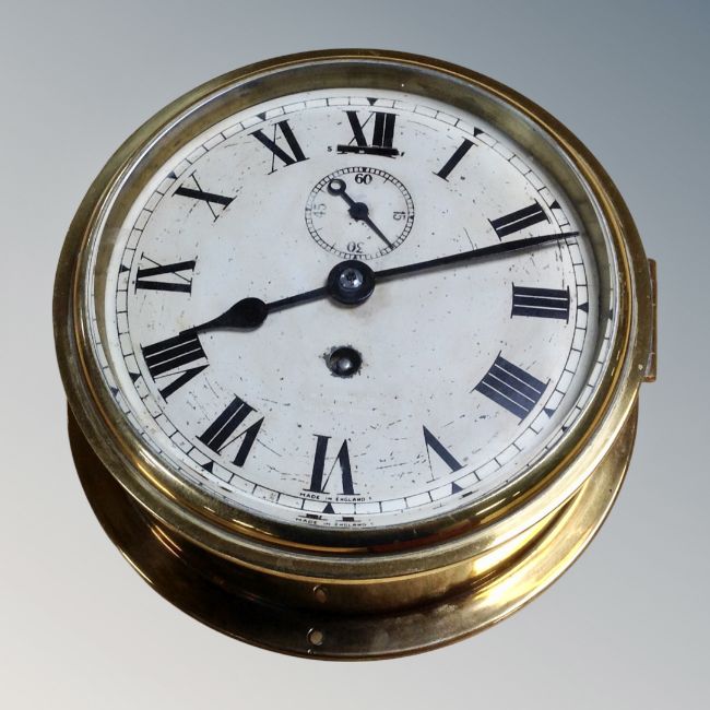 A circular brass cased wall time piece with silvered dial, diameter 18 cm