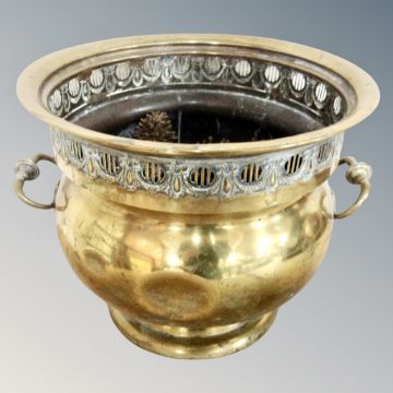 A 19th century brass twin handled planter with pierced rim, height 29 cm