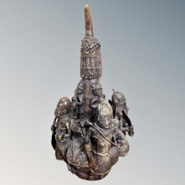 A Benin cast bronze lidded urn decorated with the Oba of Benin and his subjects, height 40 cm